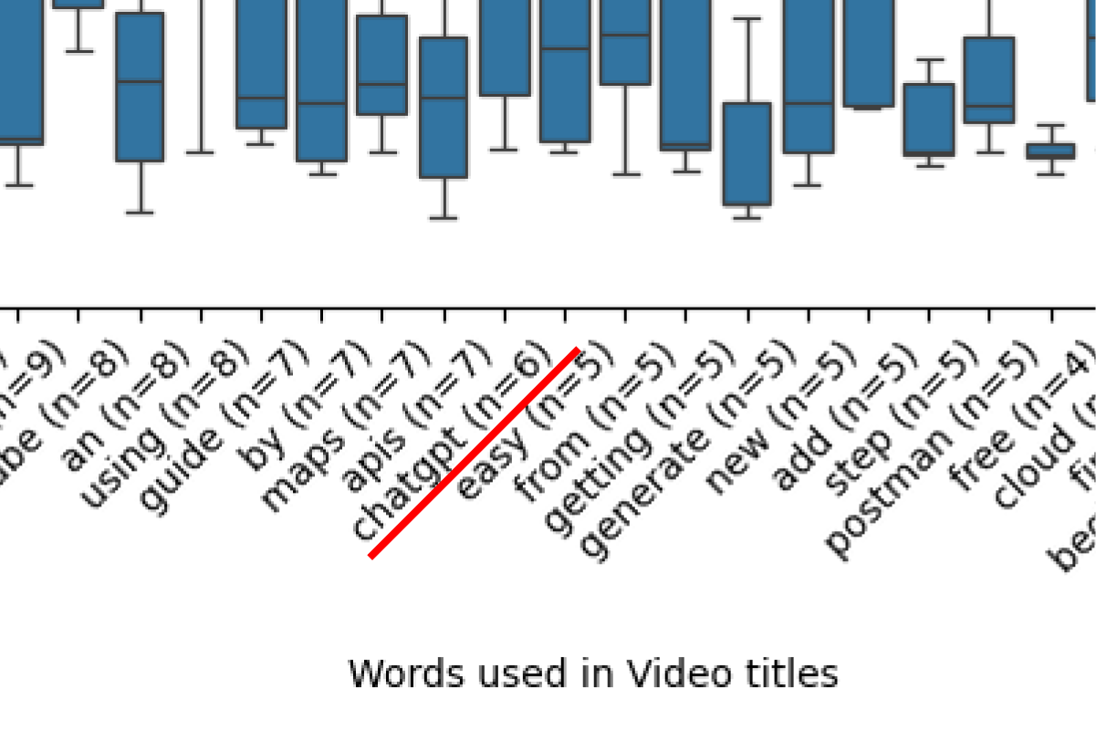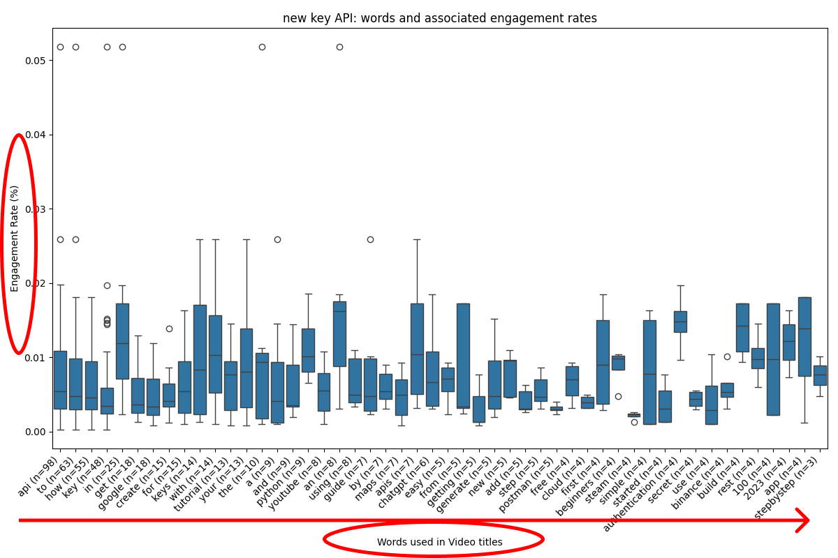 Each column extending vertically corresponds to a single word. The blue box and lines, called Boxes and whiskers, map out the distribution of data points for the word. For example, "api (n=98)" tells us there are 98 videos out of the 100 that include the word "api".