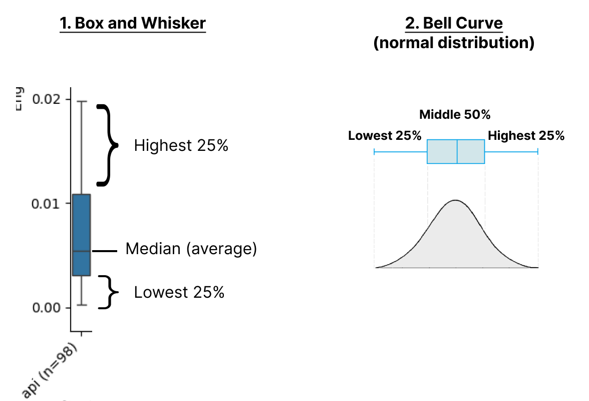 Every video has an engagement rate, so here we can see the engagement rates from all 98 videos that use the word "api" - that gives us 98 data points for "api"! Now visualising 98 dots cluttered in the same space becomes very messy. Instead of visualising each dot itself, we can visualise the distribution of the data, through either a data distribution (bell curve), or a box and whisker plot.