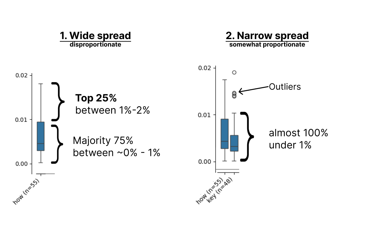 For example, the distribution belonging to "how" (n=55) shows that 75% of the data has the same spread or range as the top 25% of data. The lowest 75% ranges from values of 0% to 1% engagement rate, while the highest 25% of videos range from 1% to 2% engagement rate.
